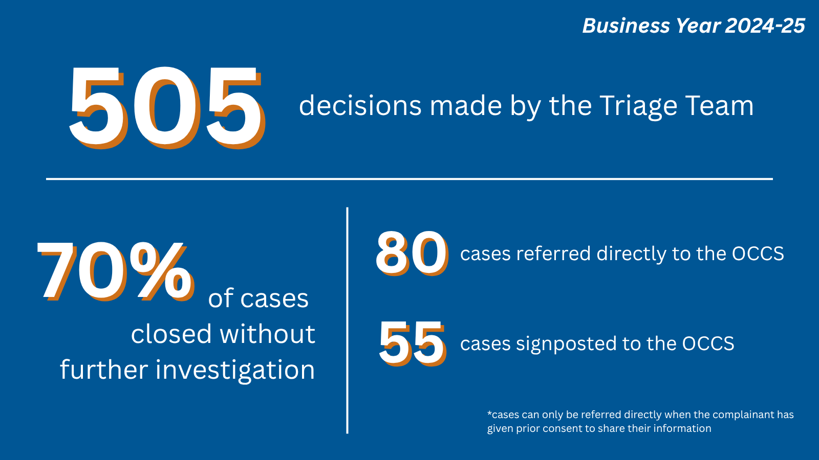 Yn y flwyddyn fusnes 2024-25, gwnaeth y Tîm Brysbennu 505 o benderfyniadau ar atgyfeiriadau dilysrwydd i ymarfer. Caewyd 70% o achosion heb ymchwiliad pellach, ac o'r rhain atgyfeiriwyd 80 yn uniongyrchol at yr OCCS a chyfeiriwyd 55 atynt. Dim ond os yw'r achwynydd wedi cydsynio o'r blaen i rannu eu gwybodaeth gyda'r gwasanaeth y gall y GOC atgyfeirio achos at yr OCCS yn uniongyrchol. Os nad yw caniatâd wedi'i roi, ond bod y Tîm Brysbennu yn teimlo y gallai'r achwynydd elwa o gefnogaeth yr OCCS, gallant eu cyfeirio at y gwasanaeth o hyd.
